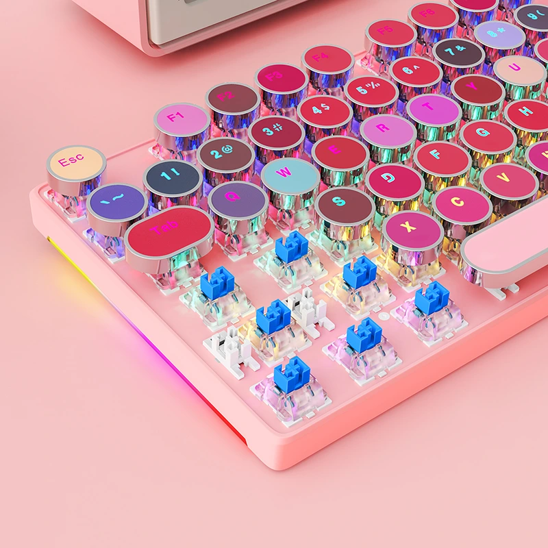 HUO JI Mechanical Gaming Keyboard Typewriter Style na may RGB Side Lit at Rainbow Backlit Retro Style Blue Switches 104 Keys Pink