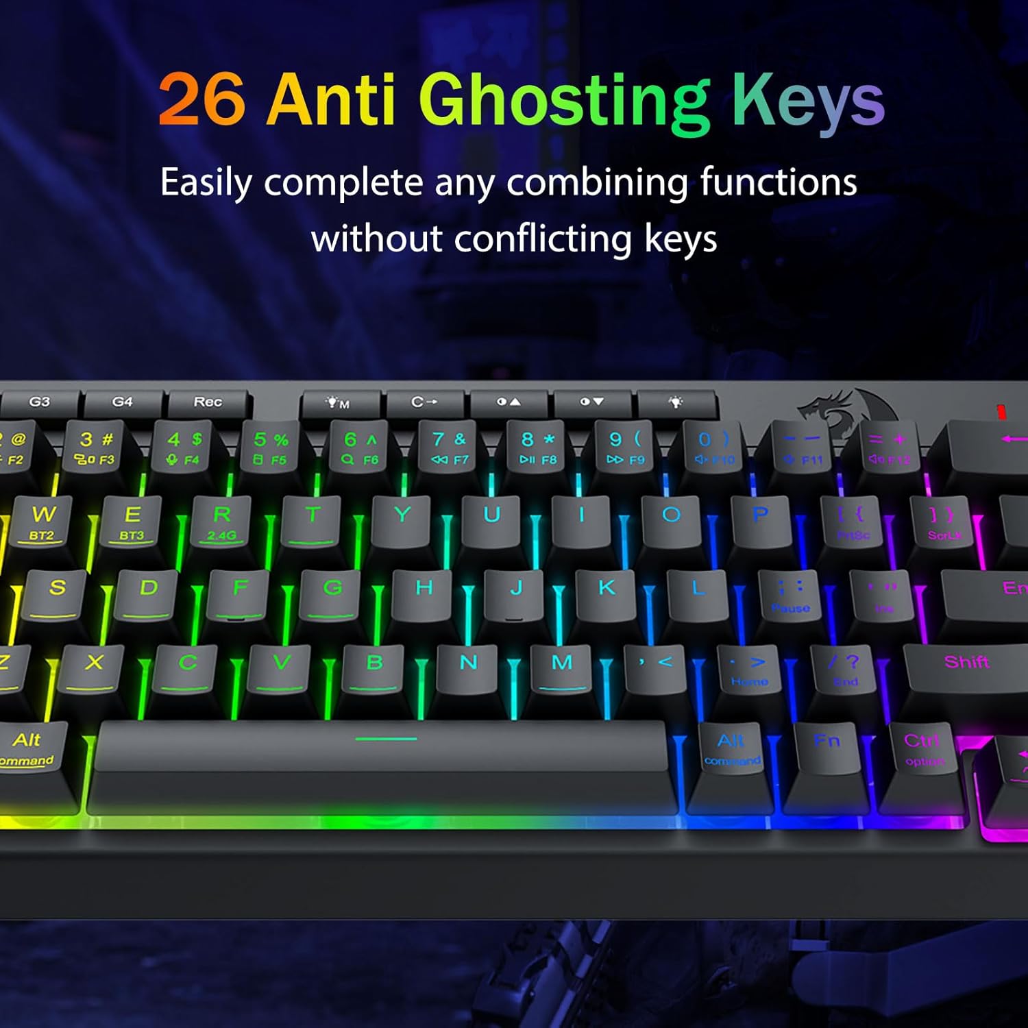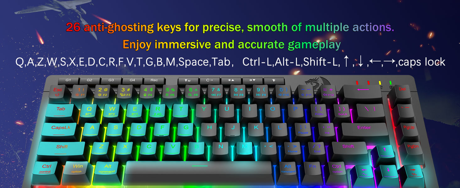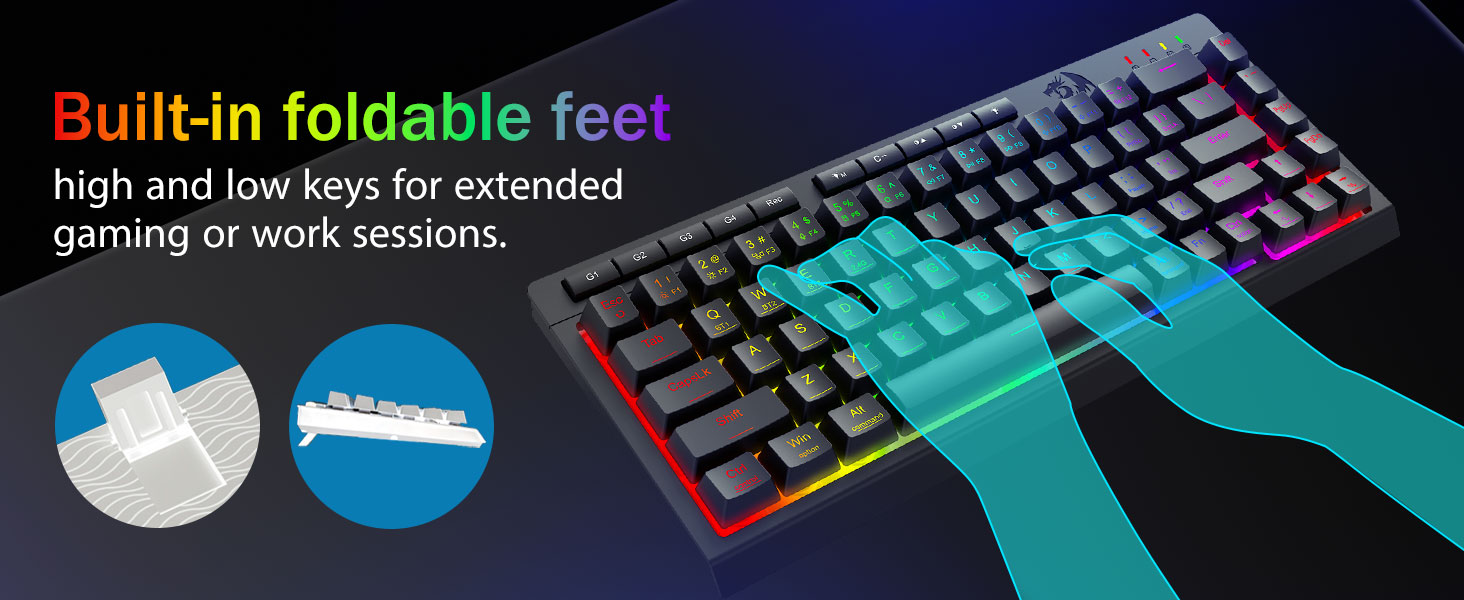Nakakalmot na pag -iilaw ng RGB at napapasadyang ambiance -Ilabas ang 16.8 milyong mga kulay ng RGB na may 8 mga mode ng preset (alon ng bahaghari, reaktibo na pag -type) + 6 na profile ng DIY. Ayusin ang ningning mula sa Vibrant Glow hanggang Stealth Mode-Malayong para sa huli-gabi na paglalaro o paggamit ng opisina.