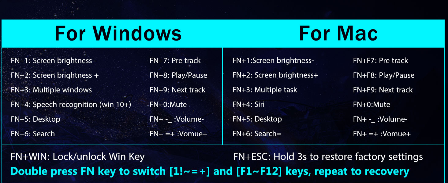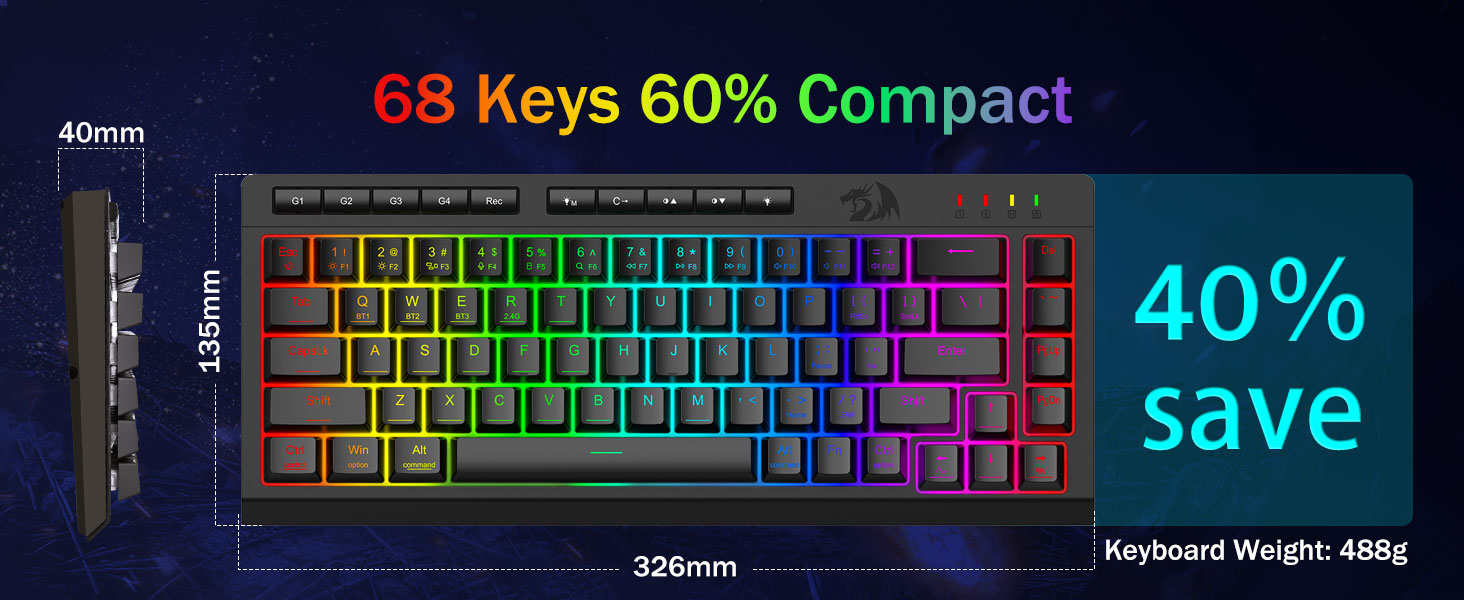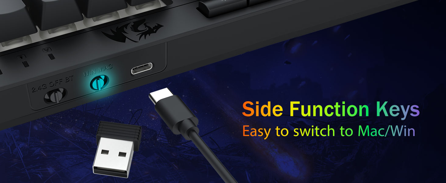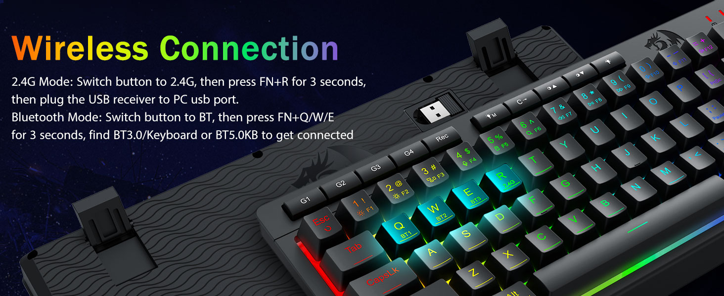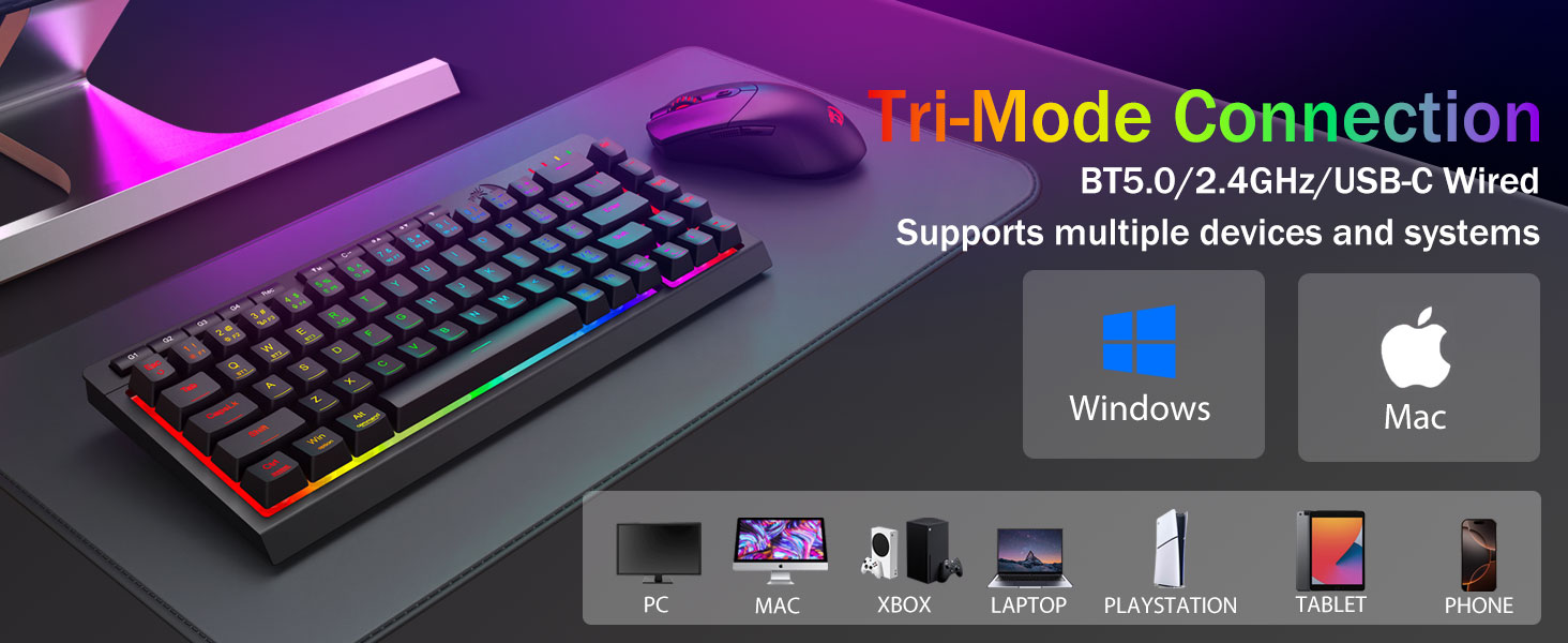 Tri-Mode Versatility & Multi-Device Mastery-Lumipat nang walang putol sa pagitan ng Bluetooth 5.0, 2.4GHz wireless, o USB-C wired mode, pagkonekta ng hanggang sa 5 mga aparato nang sabay-sabay (PC, MAC, tablet, telepono, PS/Xbox). Walang kahirap -hirap na i -toggle ang mga aparato sa pamamagitan ng mga shortcut key o side button - perpekto para sa mga hybrid na pag -setup ng trabaho/paglalaro. Manatiling pinapagana ng mga linggo kasama ang 4,000mAh baterya (30+ araw na standby, 50hrs RGB runtime).
