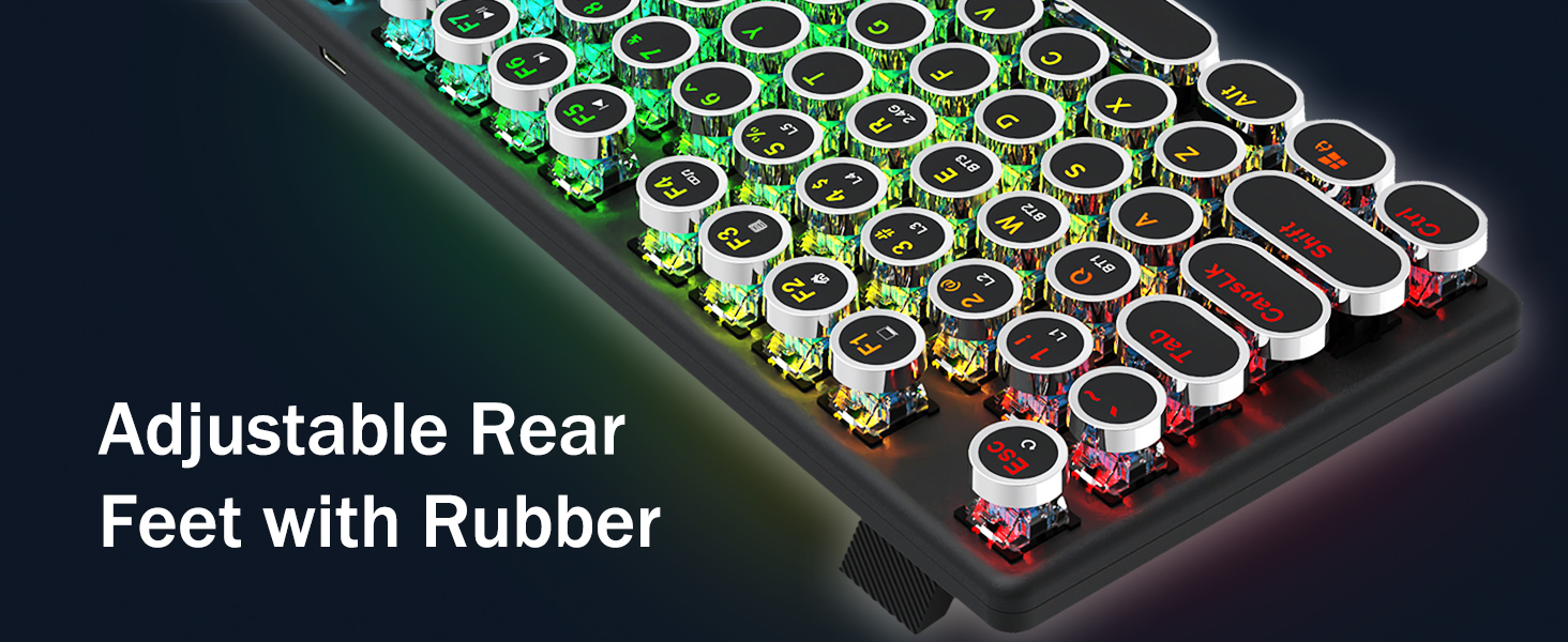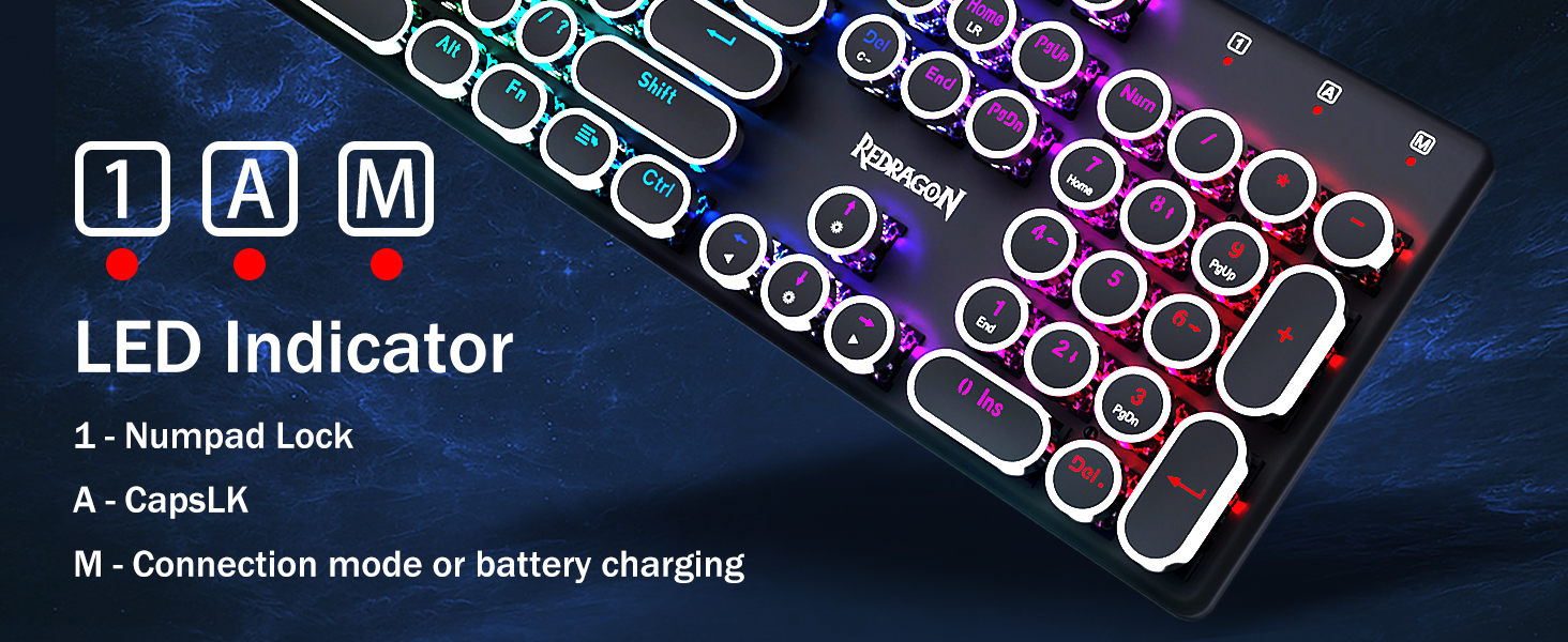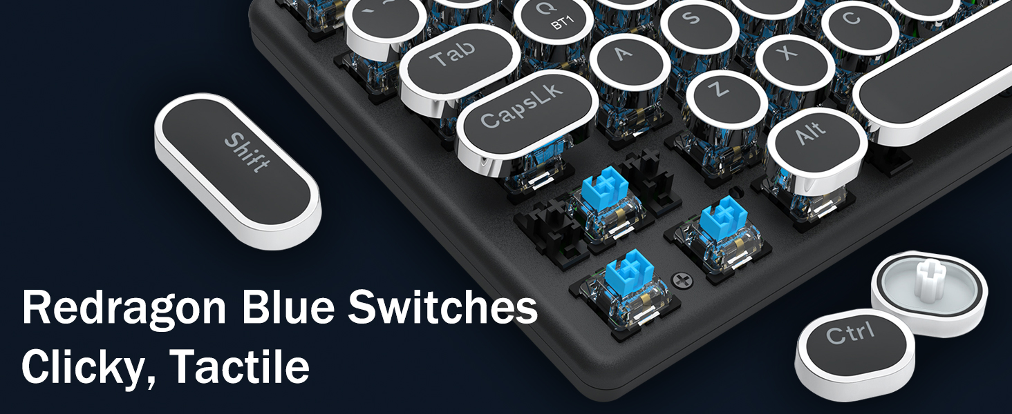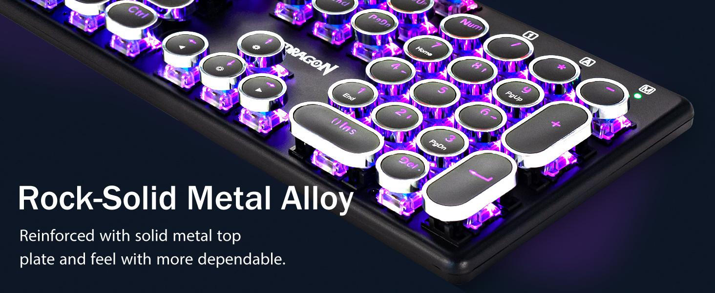 𝗥𝗲𝘁𝗿𝗼 𝗧𝘆𝗽𝗲𝘄𝗿𝗶𝘁𝗲𝗿 𝗦𝘁𝘆𝗹𝗲 𝘄𝗶𝘁𝗵 𝗠𝗲𝗰𝗵𝗮𝗻𝗶𝗰𝗮𝗹 𝗞𝗲𝘆𝘀 -Nag -aalok ang Redragon Mechanical Blue switch ng daluyan na paglaban, naririnig na pag -click sa Clacky Sound & Tactile Feedback, ay nagbibigay ng tumutugon at tumpak na kapaligiran sa paglalaro at pagganap. Ang Vintage Steampunk Keyboard Round Keycaps ay mukhang isang klasikal na makinilya, ay nagdadala sa iyo ng komportableng pag -type ng pakiramdam at matatag na pag -click sa touch.