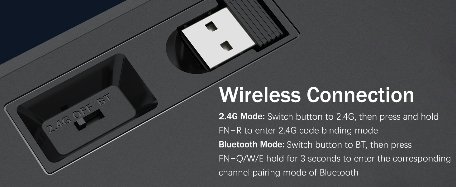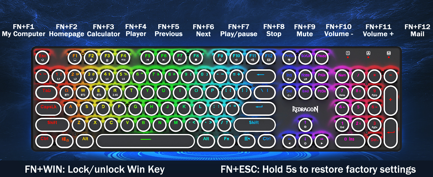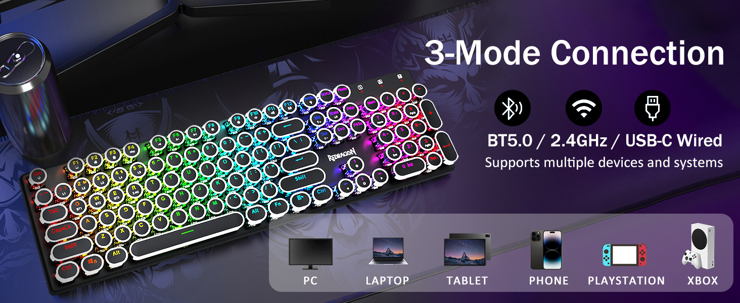 𝟯 -𝗠𝗼𝗱𝗲 𝗖𝗼𝗻𝗻𝗲𝗰𝘁𝗶𝗼𝗻 -Geared na may Redragon Innovative Tri-Mode na teknolohiya ng koneksyon, USB-C Wired, Bluetooth 5.0/3.0 & 2.4GHz wireless mode na ginagawang na-upgrade ang karanasan ng gumagamit sa isa pang antas sa lahat ng larangan. Pindutin ang FN+Q/W/E sa mode ng Bluetooth, pindutin ang FN+R hanggang 2.4G mode.