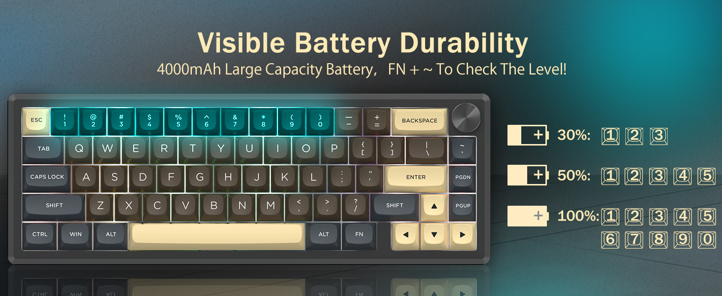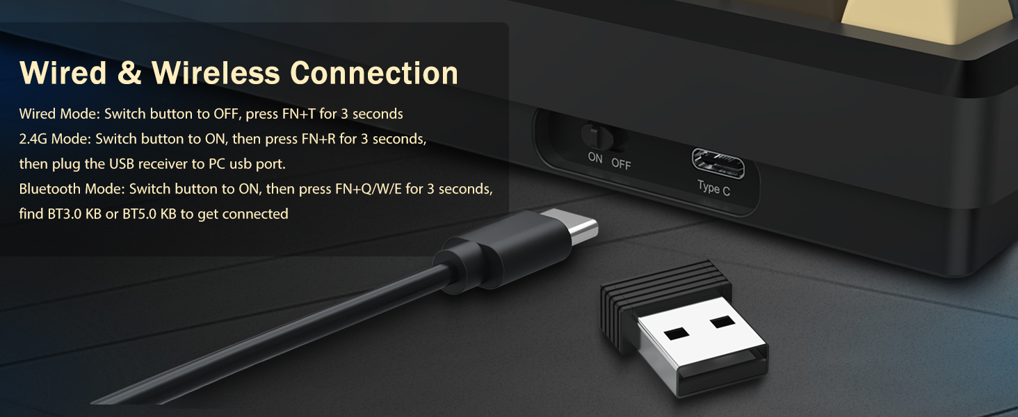 Sinusuportahan ng keyboard ang wireless na koneksyon para sa kaginhawahan at isang wired na koneksyon sa USB para sa matatag na pagganap. Maaaring lumipat ang mga user sa pagitan ng mga mode depende sa kanilang setup.