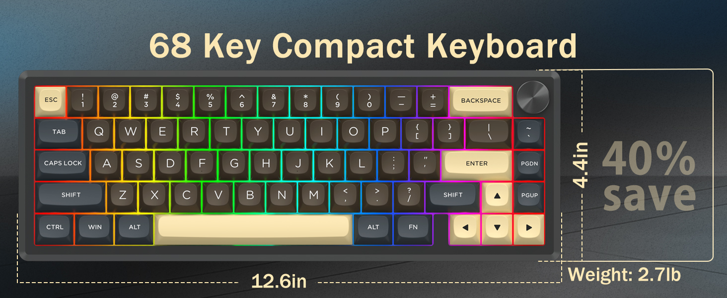 Tinatanggal ng 60% na layout ang function row, navigation cluster, at numeric keypad. Lumilikha ito ng mas maliit na footprint habang pinapanatili ang mahahalagang function ng pag-type sa pamamagitan ng mga layered na shortcut.