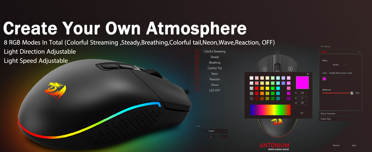 8 disenteng mga mode ng backlit ng RGB- I -on ang backlit at gumawa ng ilang mga pagpatay sa iyong gaming battlefield. Ang hyped dynamic na RGB backlit vibe ay hindi ka pababayaan kapag pinalamutian ang iyong puwang sa paglalaro, magiging mas mahusay ito sa iba pang mga accessories ng redragon na may mga ilaw.