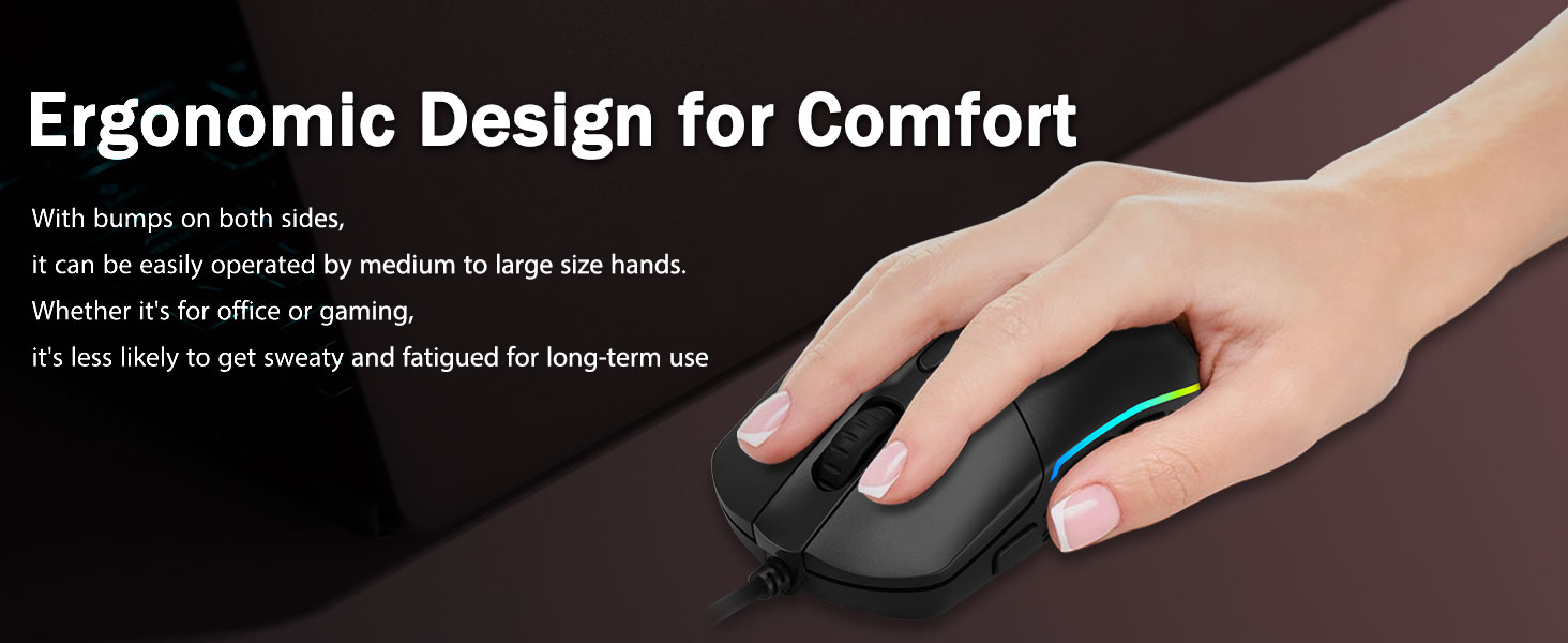 Ginhawa- Ang mga ergonomikong paga sa magkabilang panig ay ginagawang magkasya ang mga daga sa paglalaro sa anumang mga kamay. Nagbibigay ito ng pangmatagalang kaginhawaan para sa mga manlalaro, nang walang pagkapagod kahit na sa mahabang oras ng matinding gameplay. Hindi ito madulas kapag itinaas ang gaming mouse, o mabilis at tumpak na mga swipe.
