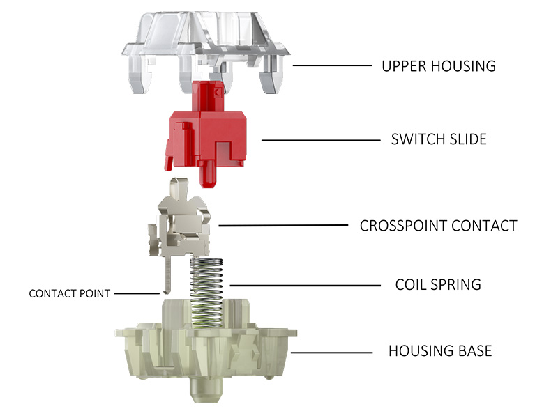 Ang disenyo ng mga linear switch ay naglalayong mabawasan ang pagkagambala sa paglaban. Ang pagkakaiba -iba ng istruktura sa pagitan ng mga linear at tactile switch ay nagpapakita sa kanilang mga mekanismo ng pag -arte: ang mga linear switch ay gumagamit ng makinis na gabay sa gabay ng stem at tuwid na cylindrical spring, na walang mga bukol o hakbang sa base ng stem. Kapag pinindot, ang tangkay ay bumababa nang magkakasunod, habang ang paglaban sa tagsibol ay tumataas nang pantay. Sa kaibahan, ang mga switch ng tactile ay lumikha ng biglaang mga pagbabago sa tactile sa pamamagitan ng mga mekanikal na istruktura-ang mga switch ay gumagamit ng isang coil spring at crosspoint contact na naglalabas ng kinetic energy sa kalagitnaan ng stroke, na gumagawa ng isang dalawang yugto na "pag-click" na may binibigkas na feedback at tunog. Ang mga pagkakaiba -iba ng istruktura na ito ay direktang tukuyin ang kanilang mga profile ng tactile: Ang mga linear switch ay nag -aalok ng kinis na may mga curves ng paglaban, habang ang mga switch ng tactile ay sadyang lumikha ng itinanghal na puna para sa isang mas interactive na pag -type ng ritmo.