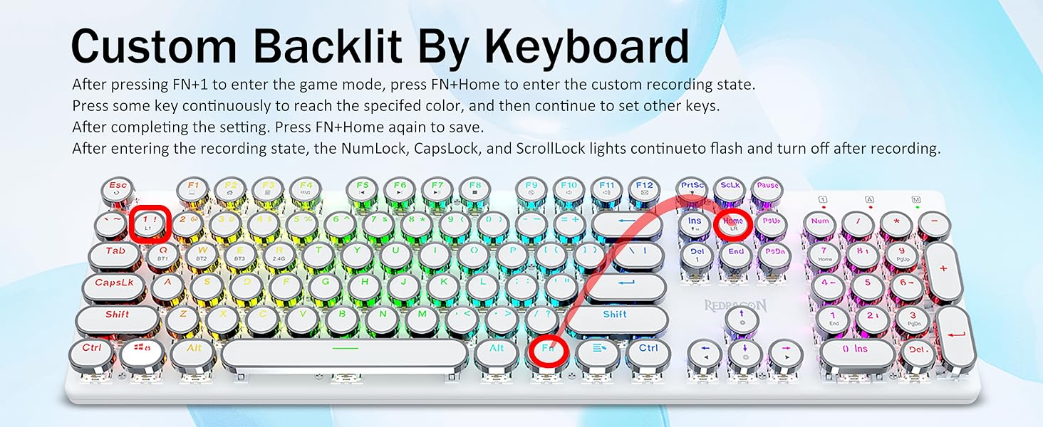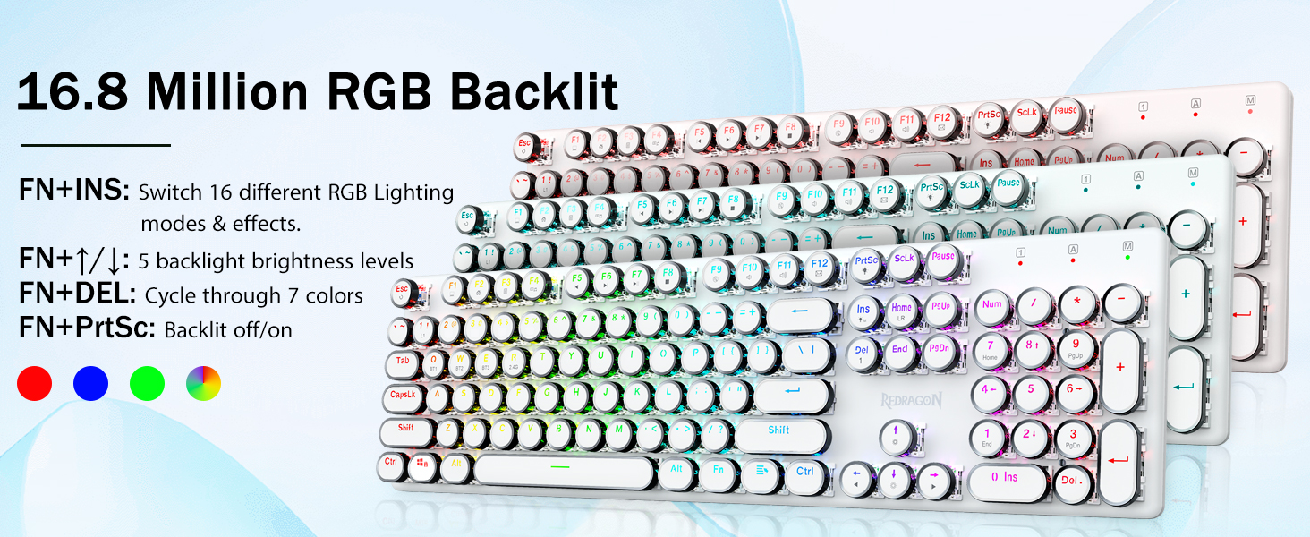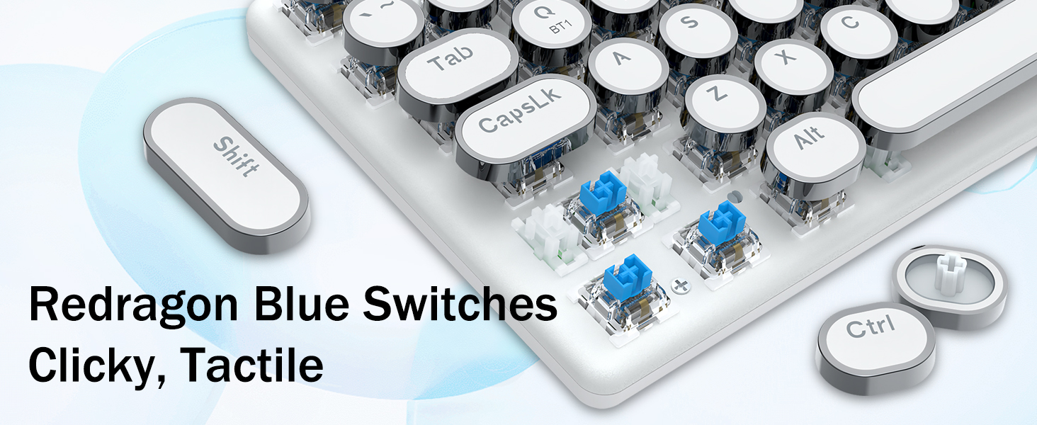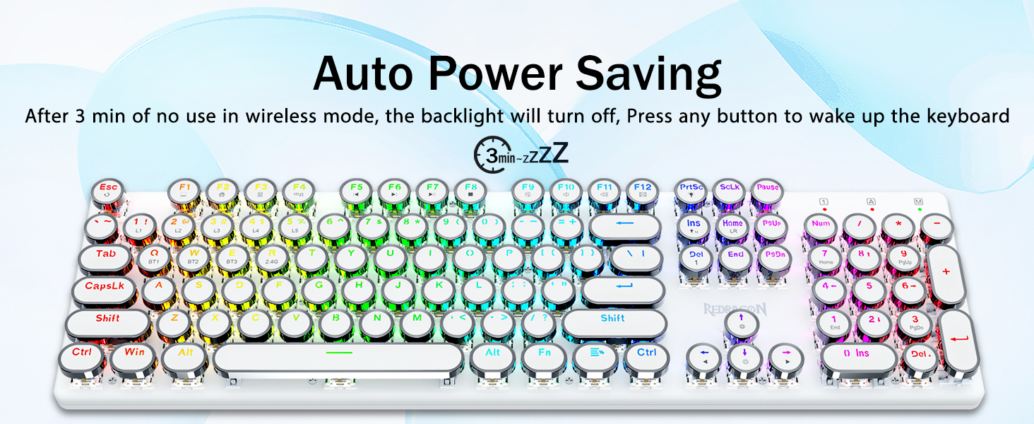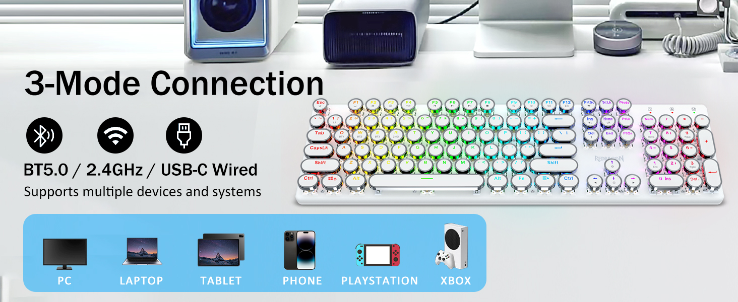 𝗥𝗲𝘁𝗿𝗼 𝗧𝘆𝗽𝗲𝘄𝗿𝗶𝘁𝗲𝗿 𝗦𝘁𝘆𝗹𝗲 𝘄𝗶𝘁𝗵 𝗠𝗲𝗰𝗵𝗮𝗻𝗶𝗰𝗮𝗹 𝗞𝗲𝘆𝘀-Geared na may Redragon Innovative Tri-mode na teknolohiya ng koneksyon, USB-C Wired, Bluetooth 3.0/5.0 & 2.4GHz wireless mode na ginagawang na-upgrade ang karanasan ng gumagamit sa isa pang antas sa lahat ng larangan. Pindutin ang FN+Q/W/E sa mode ng Bluetooth, pindutin ang FN+R hanggang 2.4G mode.