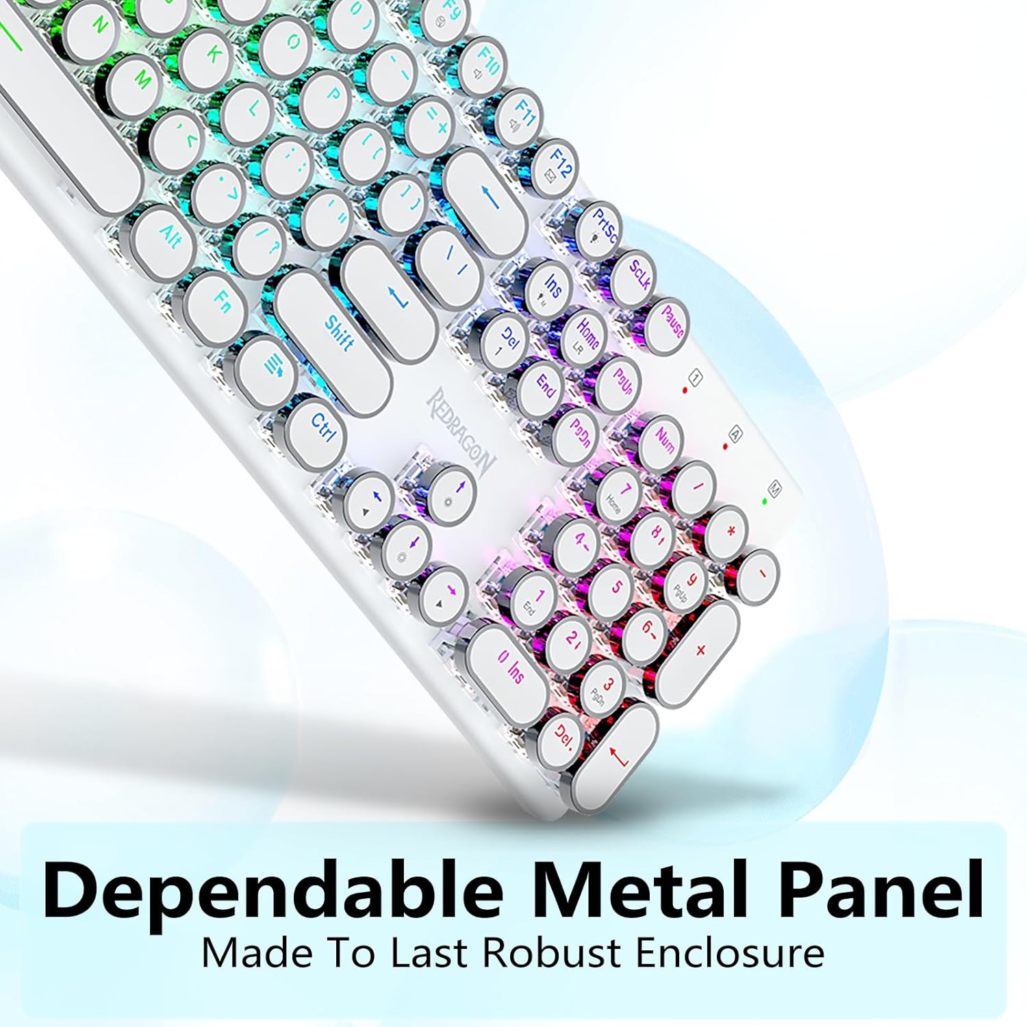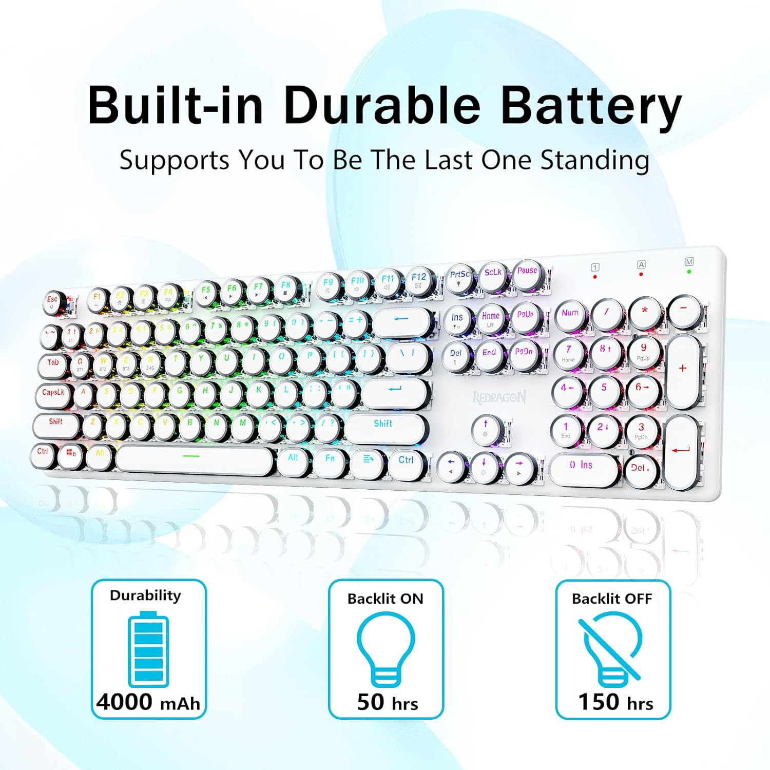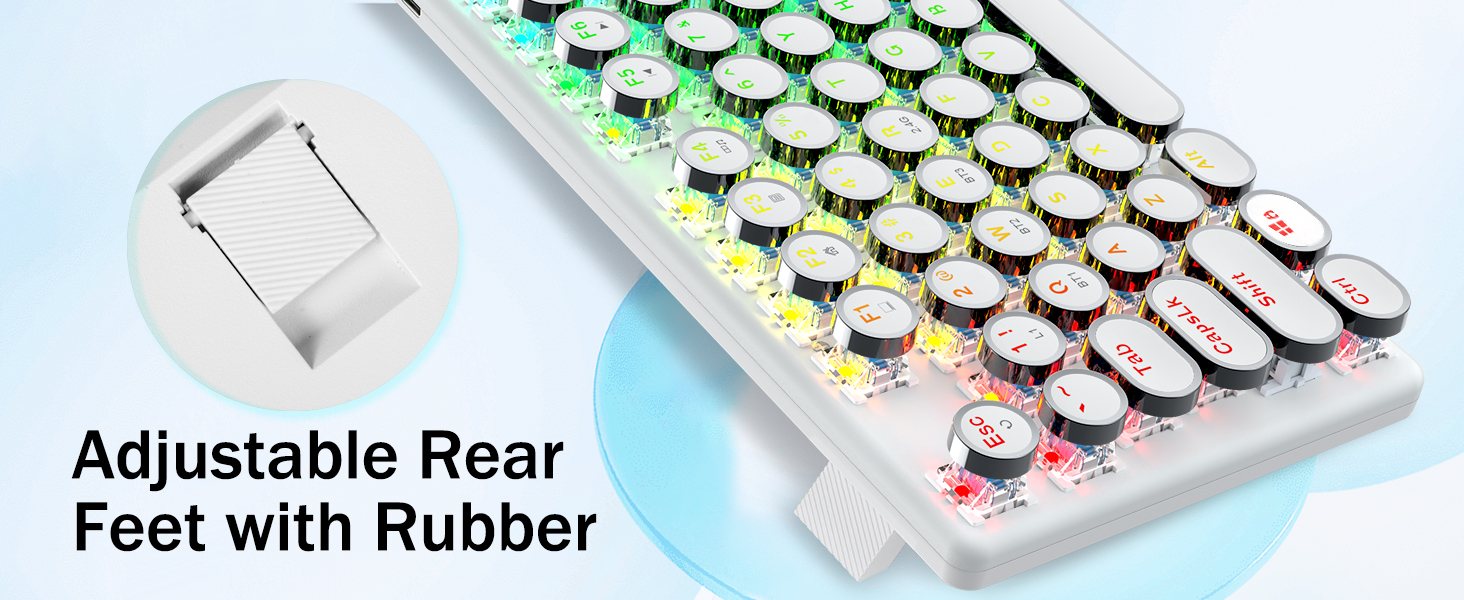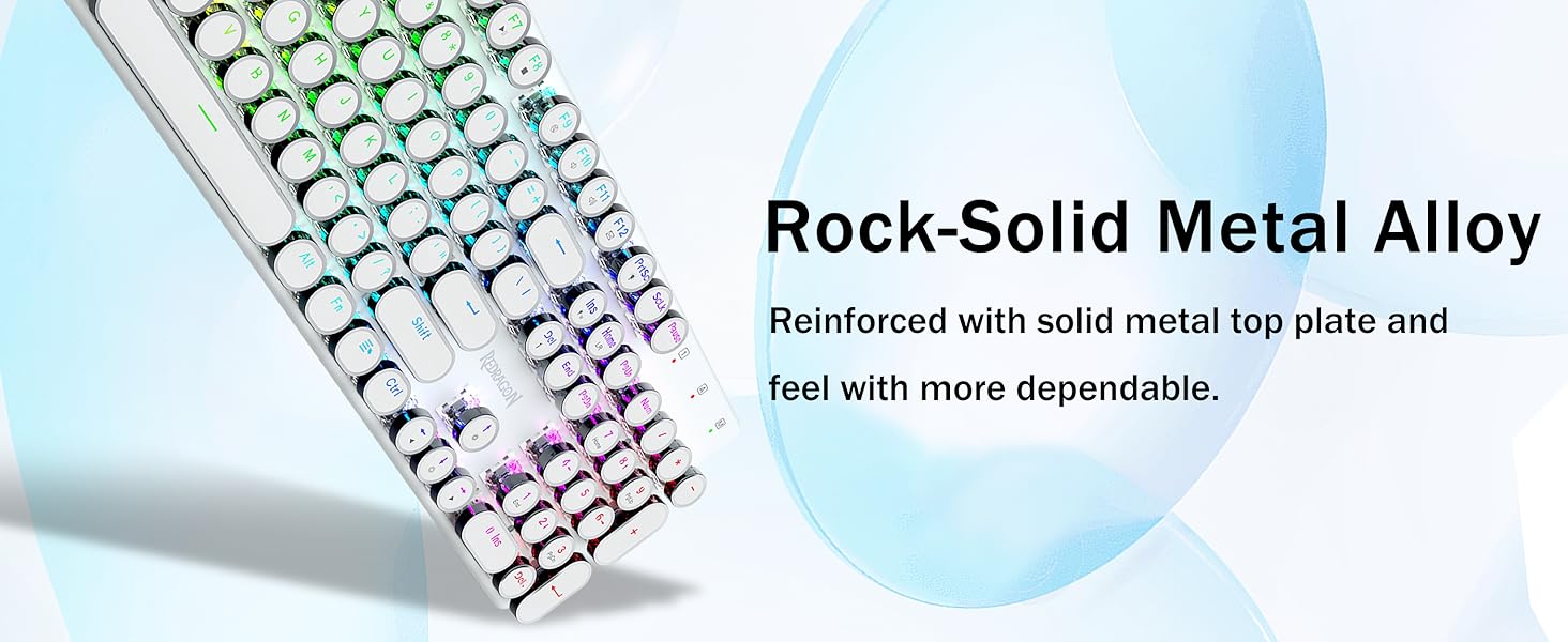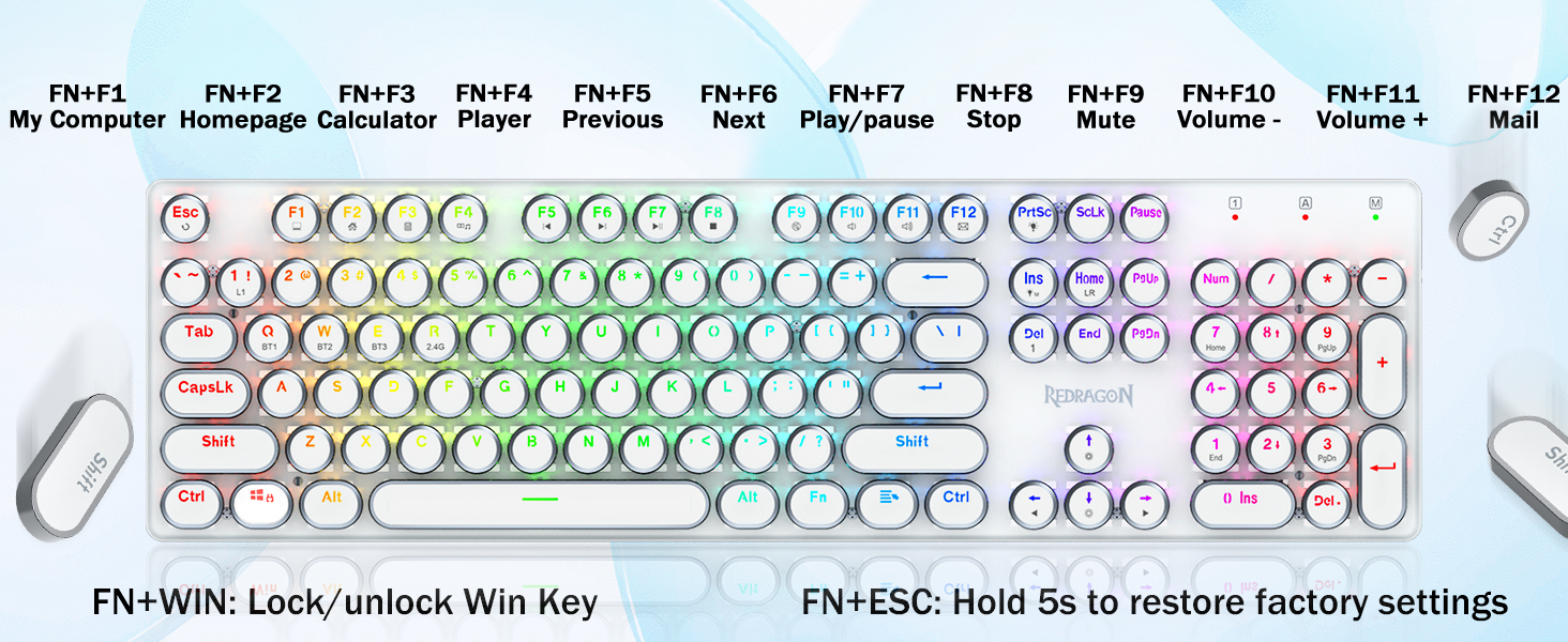 𝗥𝗲𝘁𝗿𝗼 𝗧𝘆𝗽𝗲𝘄𝗿𝗶𝘁𝗲𝗿 𝗦𝘁𝘆𝗹𝗲 𝘄𝗶𝘁𝗵 𝗠𝗲𝗰𝗵𝗮𝗻𝗶𝗰𝗮𝗹 𝗞𝗲𝘆𝘀-Geared na may Redragon Innovative Tri-mode na teknolohiya ng koneksyon, USB-C Wired, Bluetooth 3.0/5.0 & 2.4GHz wireless mode na ginagawang na-upgrade ang karanasan ng gumagamit sa isa pang antas sa lahat ng larangan. Pindutin ang FN+Q/W/E sa mode ng Bluetooth, pindutin ang FN+R hanggang 2.4G mode.