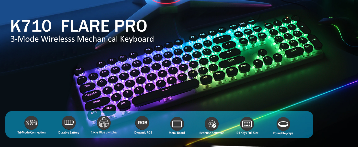 𝗗𝗲𝗽𝗲𝗻𝗱𝗮𝗯𝗹𝗲 𝗠𝗲𝘁𝗮𝗹 𝗣𝗮𝗻𝗲𝗹 & 𝟭𝟬𝟰 𝗞𝗲𝘆𝘀 𝗔𝗻𝘁𝗶 𝗚𝗵𝗼𝘀𝘁𝗶𝗻𝗴- Ang na-upgrade na bersyon ng Flare Pro ay patuloy na gumagamit ng parehong tangke-solid metal na materyal. Panatilihing matatag at matikas ang keyboard sa desk, para sa isang premium na karanasan sa pag -type. Ang K710 keyboard ay sumusuporta sa 104-key na anti-ghosting na teknolohiya, ay nagbibigay-daan sa maraming mga susi na pindutin nang sabay na walang salungatan.